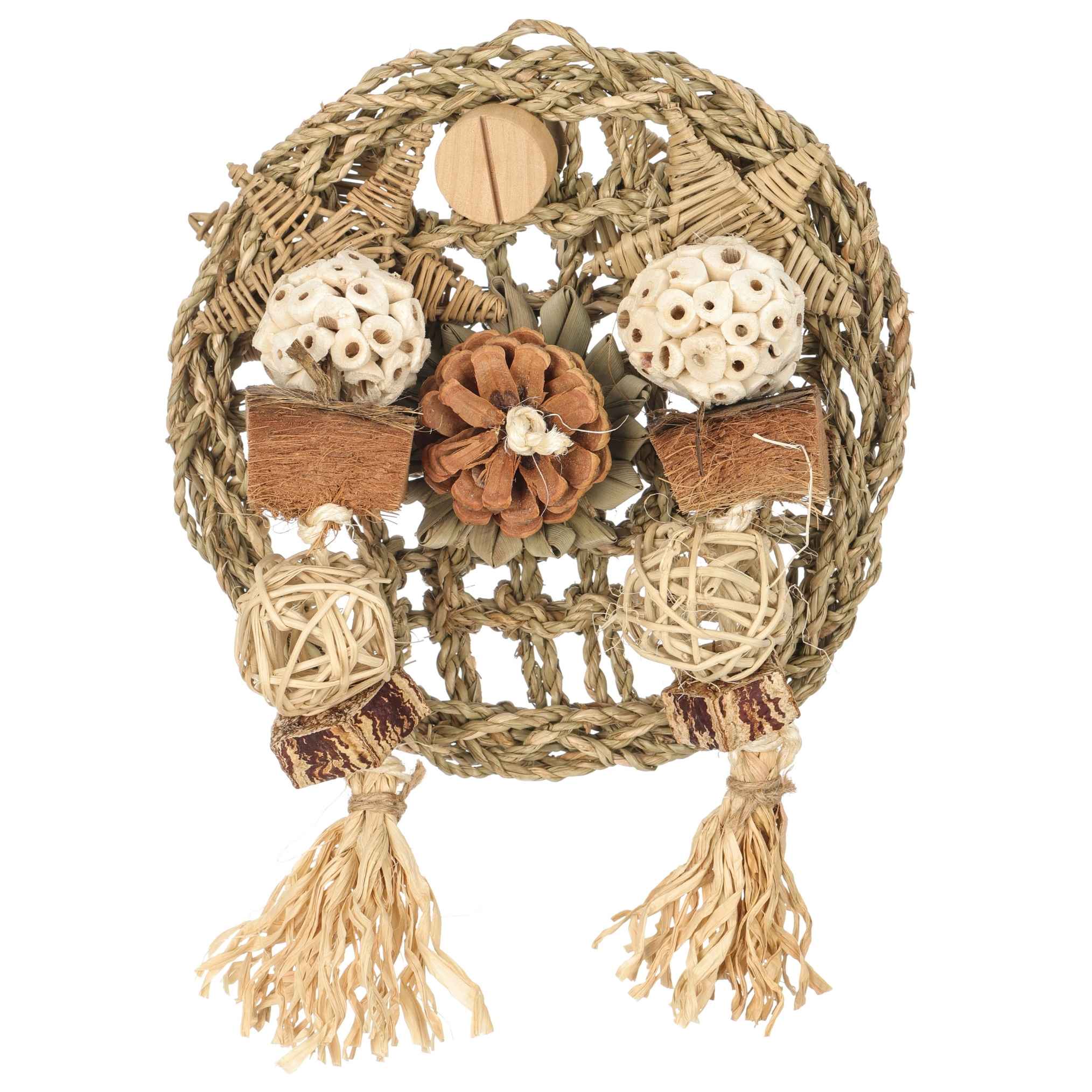 Het speeltje heeft een afmeting van 30x20cm en is vervaardigd uit hoogwaardige materialen zoals sisaltouw, wilgenballen, sola hout, kokosvezel, mahoniepeul, en raffia. Deze materialen zijn geselecteerd om de papegaai te stimuleren en een afwisselende speelkans te bieden, wat bijdraagt aan hun welzijn.