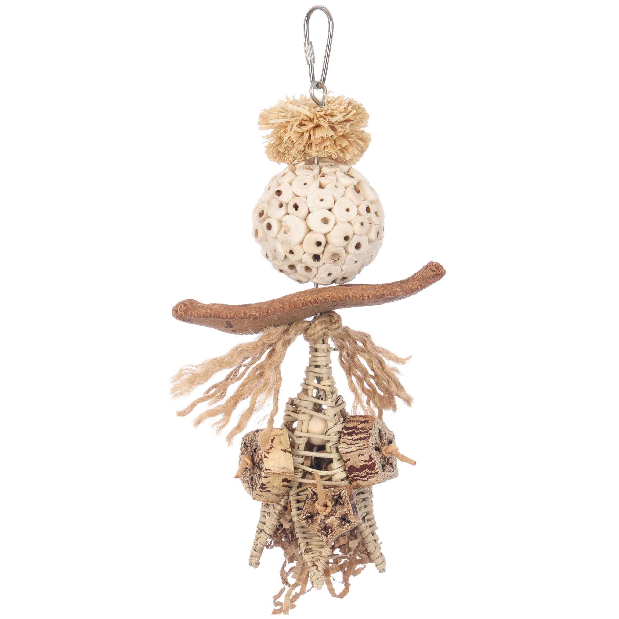 Het QUAPAS! Fun papegaaienspeelgoed is dé perfecte manier om je vogel te stimuleren en verveling tegen te gaan. Dit speeltje combineert natuurlijke materialen zoals jute touw, sola hout, maïsblad, wilgentakken en mahoniepeul met een stevige ijzerdraad en een metalen gesp voor veilige bevestiging in de kooi. Dankzij de verschillende texturen en vormen blijft je papegaai geïnteresseerd en krijgt hij volop de kans om te knagen, trekken en spelen.