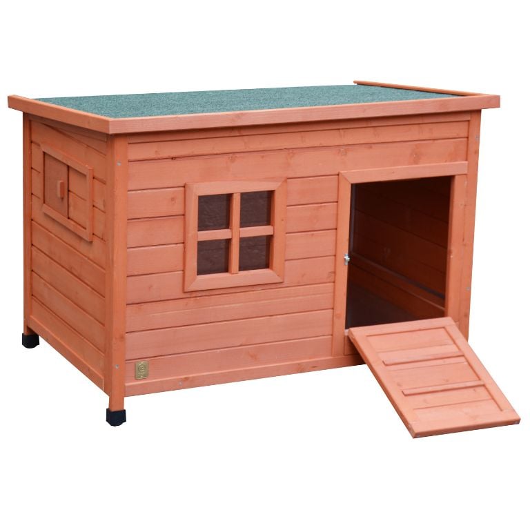 Het hok heeft een robuust ontwerp met een stevig, waterdicht dak dat bescherming biedt tegen regen en zon. De bodem is afneembaar voor gemakkelijke schoonmaak, en er zijn ventilatieopeningen om een gezonde luchtstroom te waarborgen. Het bruine uiterlijk past mooi in elke tuin of buitenruimte.