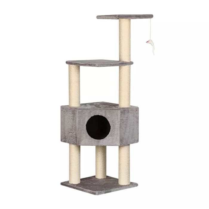 De krabpaal bevat vier stevige sisalpalen, die jouw kat voldoende mogelijkheden geven om zijn nagels te scherpen. Dat voorkomt ongewenst krabgedrag en zorgt voor gezonde nagels. Het kleine speelmuisje dat bovenin hangt, zorgt voor extra beweging en uitdaging. Dit houdt je kat niet alleen fysiek actief, maar prikkelt ook zijn natuurlijke jachtinstinct. Alles is afgewerkt met heerlijk zacht pluche voor optimaal comfort en een luxueuze uitstraling. De lichtgrijze kleur maakt deze krabpaal een stijlvolle aanvulling op je interieur.