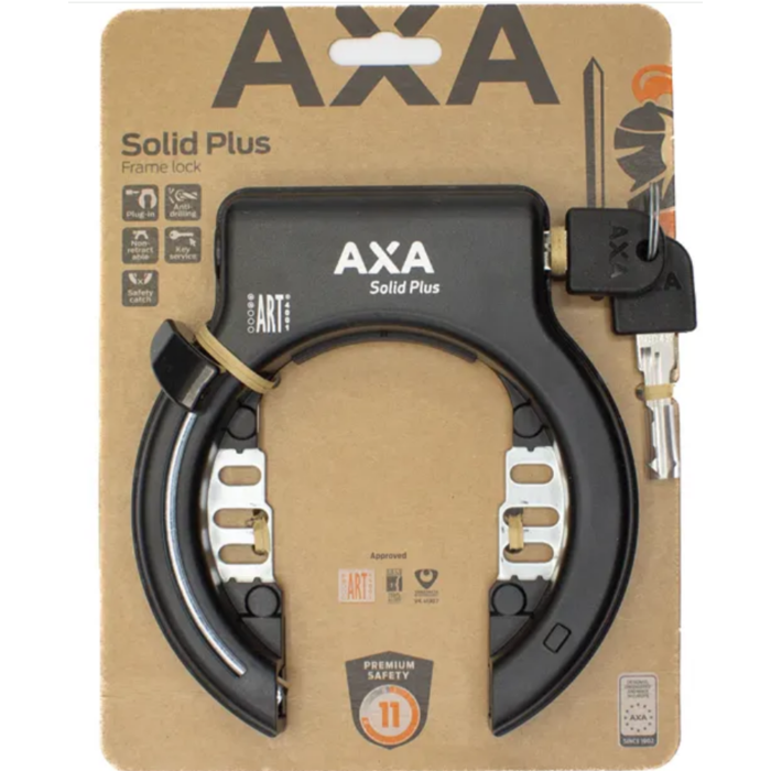 De AXA Solid Plus kan op diverse manieren gemonteerd worden, met standaardmontage op de montagegaten in het fietsframe. Voor fietsframes zonder montagegaten kunnen de AXA Flex mount strips gebruikt worden. Het slot voldoet aan de ART 2 sterren norm en is daarmee goedgekeurd voor fietsverzekeringen in Nederland en het Verenigd Koninkrijk.