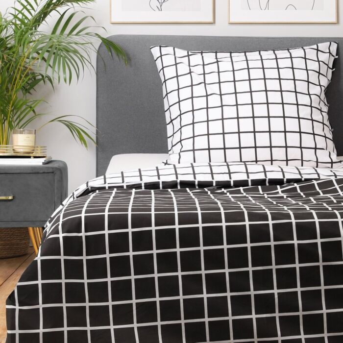 Met zijn unieke zwart-wit ruitpatroon biedt de REYES bed set de mogelijkheid om de uitstraling van je slaapkamer eenvoudig te veranderen. Een kant is gedecoreerd met een zwart-witte ruit, terwijl de andere kant een wit-zwart ruitpatroon heeft, zodat je zelf de sfeer kunt bepalen. Dit element van veelzijdigheid maakt het beddengoed een uitstekende investering.