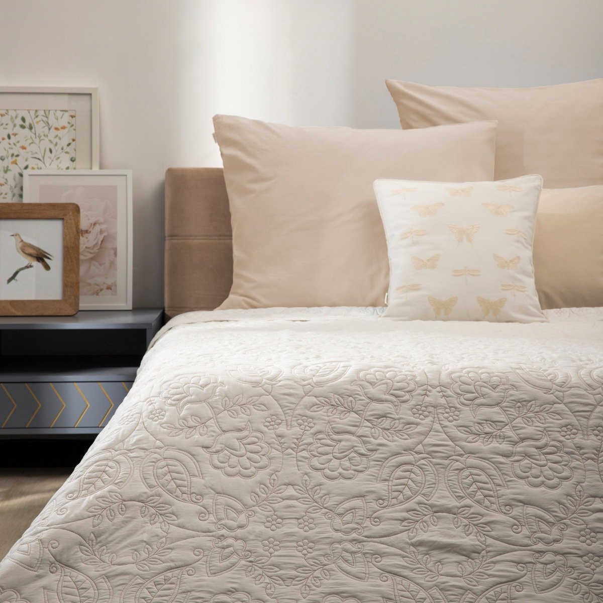 Wprowadź do swojej sypialni delikatność i świeżość z narzutą CLUDO. Jej jasny design ozdobiony precyzyjnym haftem we florystyczne motywy subtelnie ożywia wnętrze, nie przytłaczając go. To doskonały wybór dla osób ceniących minimalistyczne, a zarazem przytulne aranżacje.