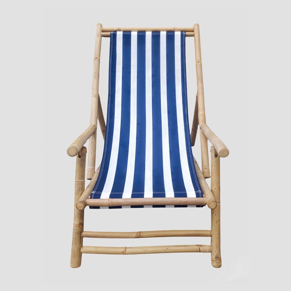 De MARE lounger neemt je gedachten mee naar de zeepromenade. Het kenmerkende blauw-witte streepjespatroon weerspiegelt de nautische stijl die nooit uit de mode raakt. Het solide frame, gemaakt van natuurlijk bamboe, voegt warmte en exotische charme toe. Het is de perfecte keuze voor degenen die graag willen ontspannen in een mooie omgeving.