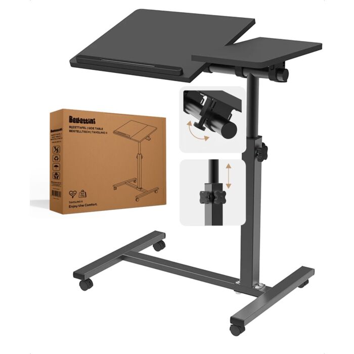 De Merah laptoptafel is niet alleen een comfortabele laptopstandaard; hij functioneert ook uitstekend als bijzettafel voor zowel snacks als drankjes. Perfect voor gebruik in de woonkamer, op kantoor of zelfs als nachtkastje. Dankzij de wielen kun je de tafel eenvoudig verplaatsen naar de plek waar je hem het meest nodig hebt.