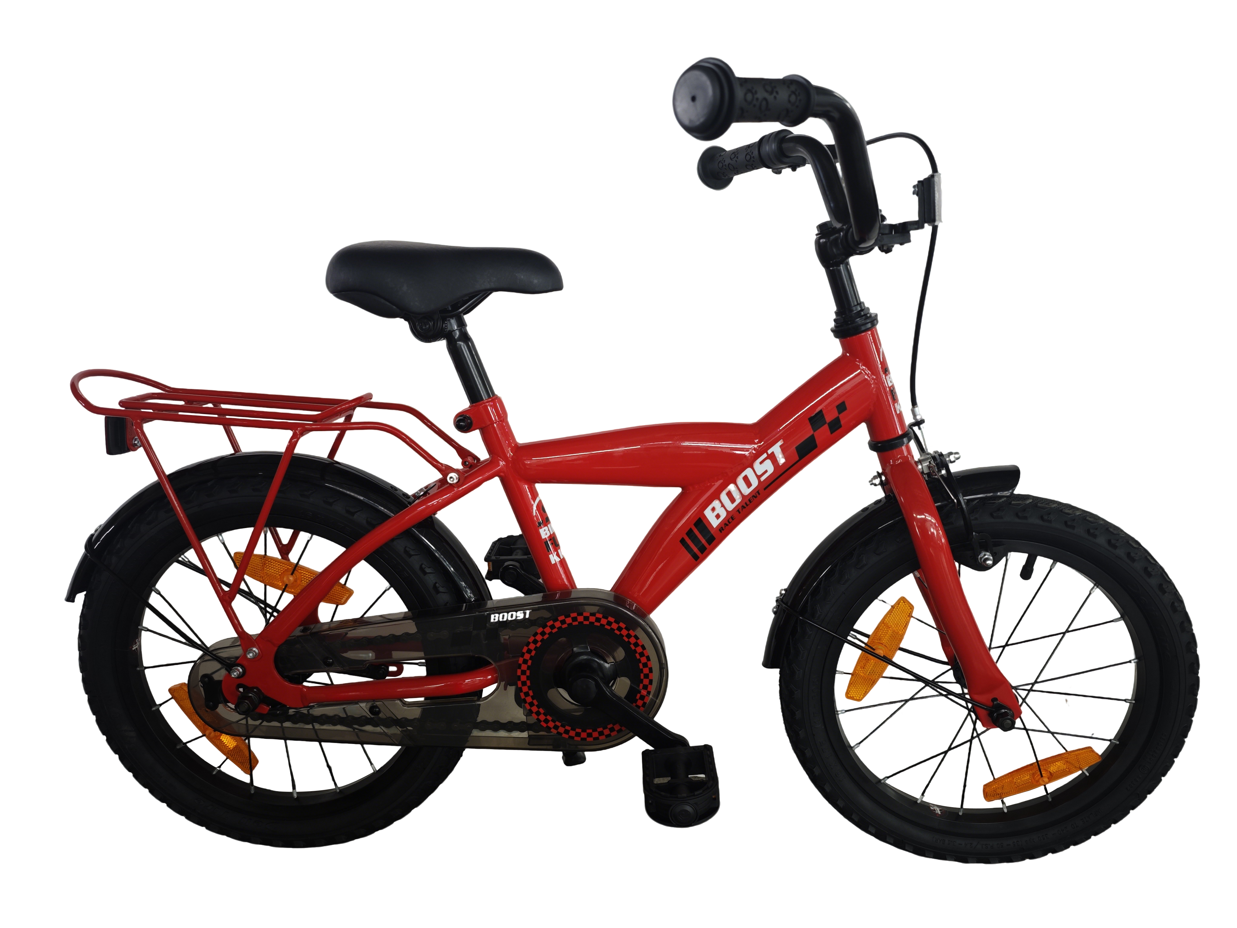 De Bikefun Boost 16 inch is een sportieve jongensfiets in een opvallende rode kleur, ontworpen voor kinderen van ca. 4 tot 6 jaar. Deze fiets combineert een robuuste uitstraling met praktische functionaliteit en is perfect voor jonge fietsers die klaar zijn voor meer zelfstandigheid en avontuur. Met het sterke stalen frame, een gesloten kettingkast en zowel terugtrap- als handrem biedt deze fiets optimale veiligheid. De achterdrager en reflectoren maken hem ook nog eens extra handig en goed zichtbaar in het verkeer.