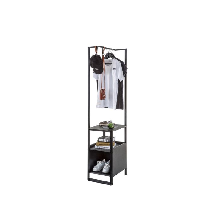 Deze stijlvolle kapstok met plank in de serie Dark Metal voegt praktische elegantie toe aan iedere studeerkamer. Hij biedt een opbergruimte voor zowel boeken als schoenen, en combineert functionaliteit met verplaatsbaar gemak.