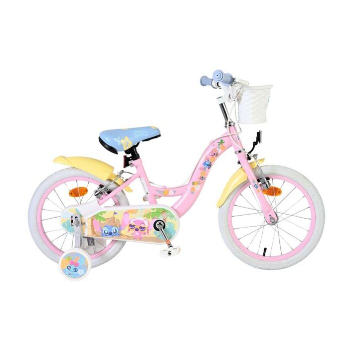 De Disney Stitch 16 inch kinderfiets is een echte blikvanger! Met haar vrolijke lichtroze frame en zonnig gele spatborden brengt deze fiets meteen een glimlach op ieders gezicht. Het leuke mandje voorop maakt de fiets extra speels en ideaal om favoriete spulletjes mee te nemen.