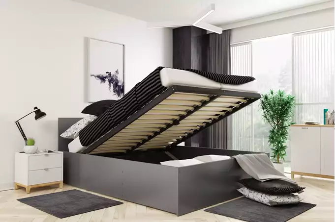 Het BMS bed PANAMAX is een fraai ontworpen meubelstuk dat perfect past in elke slaapkamer dankzij zijn neutrale graphite kleur en functionaliteit. Dit bed biedt niet alleen een comfortabele slaapomgeving maar ook een praktische opbergruimte aan de voorkant, wat het ideaal maakt voor het opbergen van beddengoed en andere items.