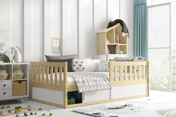 Het bed heeft een praktisch ontwerp met afgeronde hoeken voor extra veiligheid van kinderen. Het is voorzien van een opbergcontainer zonder bodem, waardoor er extra ruimte is om speelgoed of beddengoed op te bergen. De PVC-handgreep maakt het eenvoudig om de opbergcontainer te openen en te sluiten, waardoor gebruiksgemak wordt verzekerd.