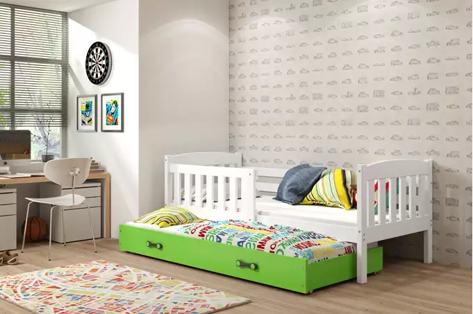 De BMS Pull-out Children's Bed KUBUÅš is een functioneel en stijlvol bed ontworpen voor kinderen, met prachtig kleuren zoals wit en groen. Dit bed is perfect voor kleinere ruimtes en biedt een uitstekende oplossing voor slaapgelegenheden. Daarnaast is het bed uitgerust met een praktische lade die een extra slaapfunctie biedt, waardoor het ideaal is voor logeerpartijtjes of als extra opbergruimte.