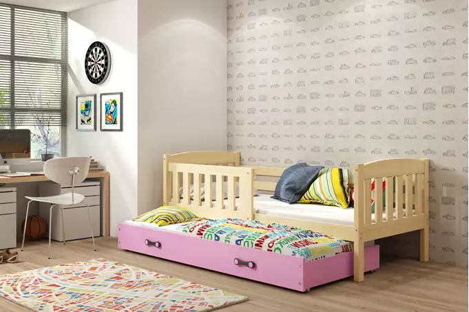 Het ontwerp van het BMS KUBUŚ bed maakt gebruik van een innovatief klik-klak systeem, wat bijdraagt aan een snelle en gemakkelijke montage. Het bed is verder uitgerust met een handige lade die extra opbergruimte biedt en snel kan worden omgevormd tot een extra slaapfunctie met gemak. Het aantrekkelijke, moderne ontwerp in combinatie met de speelse roze kleur voegt een vrolijk accent toe aan de kinderkamer.