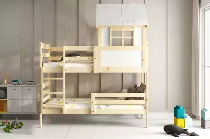 Dit bunkhouse bed is niet alleen functioneel, maar ook visueel aantrekkelijk. De unieke dakstructuur geeft het bed een speelse uitstraling, die de fantasie van kinderen stimuleert. Het praktische ontwerp maakt het eenvoudig toegankelijk, en het kan eenvoudig worden gecombineerd met andere meubelstukken in de kamer.