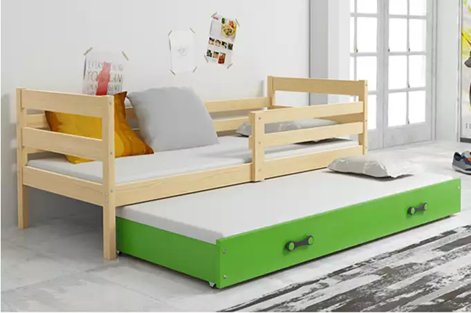 Het bed is voorzien van een frame van hoogwaardig dennenhout en is behandeld met een milieuvriendelijke watergedragen vernis. De afmetingen van het bed zijn 80x190 cm, en het wordt geleverd met twee matrassen: één van 190x80 cm en één van 180x80 cm, vervaardigd uit klimaatvezel en polyurethaanschuim. De hoes van de matrassen is gemaakt van hypoallergene polyester stof met een ritssluiting, wat bijdraagt aan het gebruiksgemak en de onderhoudsvriendelijkheid.