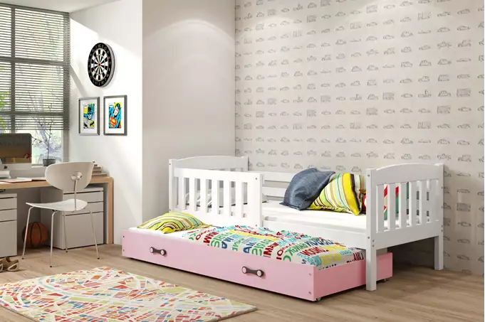 De BMS KUBUŚ extendable youth bed is een prachtige toevoeging aan elke kinderkamer. Dit bed is speciaal ontworpen voor de groei van uw kind en kan eenvoudig worden uitgebreid, waardoor het jarenlang mee kan gaan. Met een stijlvolle combinatie van wit en roze, biedt dit bed niet alleen comfort, maar ook een aantrekkelijke uitstraling.