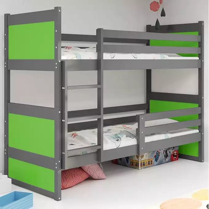 De BMS RICO jeugdbank is een veelzijdig en stijlvol stapelbed, speciaal ontworpen voor de jongere generatie. Het bed heeft een afmeting van 90x200 cm en is uitgevoerd in een moderne grafiet/groene kleurenschema, wat zorgt voor een frisse uitstraling in elke kinderkamer.