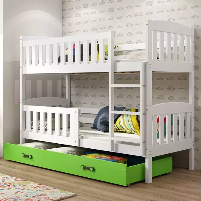 Het stapelbed is ontworpen met het oog op gebruiksgemak, met een eenvoudig montageconcept dat het mogelijk maakt om het bed snel in elkaar te zetten. De ingenieuze click-clack systeem van de lattenbodem vergemakkelijkt de montagemogelijkheid zonder gereedschap. Het bed heeft ook een lade gemaakt van spaanplaat, ideaal voor het opbergen van speelgoed of beddengoed.