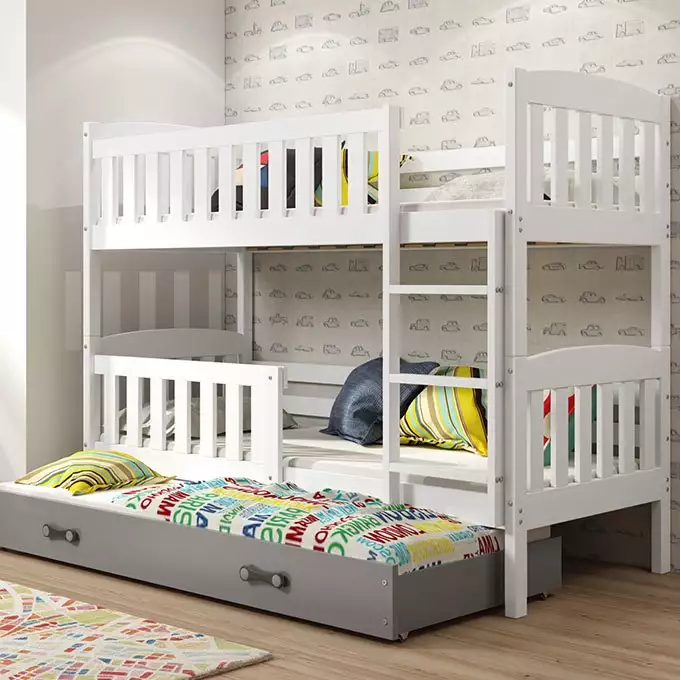Het BMS Three-Person Youth Bed KUBUÅš is een perfect meubelstuk voor de slaapkamer van uw kind. Dit bed is ontworpen om te voldoen aan de behoeften van opgroeiende kinderen, met voldoende ruimte voor drie personen. Het stijlvolle ontwerp in wit en grafiet maakt dit bed niet alleen functioneel, maar ook aantrekkelijk in iedere slaapkamer.