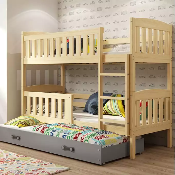 De BMS KUBUŚ triple youth bed is ideaal voor jongere gebruikers die comfort en flexibiliteit waarderen. Dit bed heeft een slank ontwerp en is uitgerust met een praktische lade die een extra slaapplaats biedt. Het frame is vervaardigd uit hoogwaardig pijnhout, dat niet alleen robuust is, maar ook een natuurlijk uiterlijk aan de slaapkamer geeft.