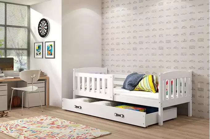 Het ontwerp van het KUBUŚ bed combineert functionaliteit met esthetiek. Met een quick assembly systeem kan het bed snel worden gemonteerd. De geïntegreerde lade is perfect voor het opbergen van speelgoed of bedlinnen, en door de afgeronde hoeken is het bed veilig in gebruik.