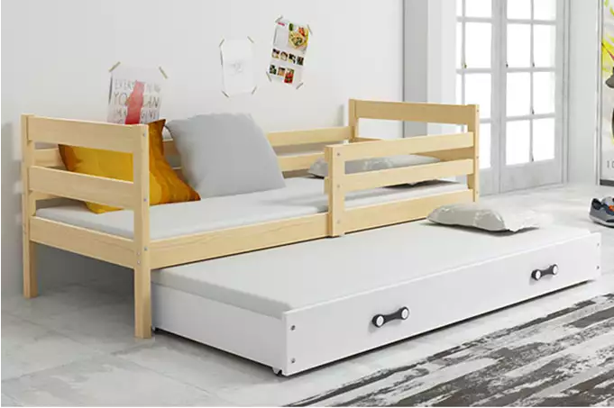 Het BMS ERYK pull-out jeugdbed biedt een ideale oplossing voor jonge kinderen die zowel behoefte hebben aan een comfortabele slaapplaats als extra opbergruimte. Dit bed is speciaal ontworpen om functioneel en stijlvol te zijn, met een prachtig dennenhouten frame in combinatie met een strakke witte afwerking.