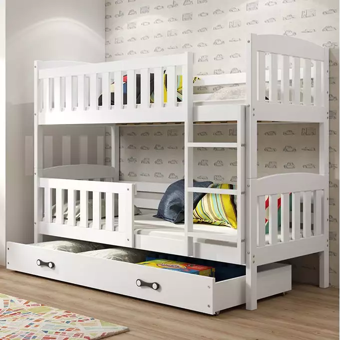 De BMS KUBUŚ jeugd stapelbed is ontworpen met functionaliteit en stijl in gedachten, ideaal voor jonge slaapkamers. Dit bed biedt niet alleen slaapcomfort, maar ook slimme opbergoplossingen met de geïntegreerde lade. De kwaliteit van het meubelstuk komt tot uiting in het gebruik van duurzame materialen en een doordacht ontwerp.