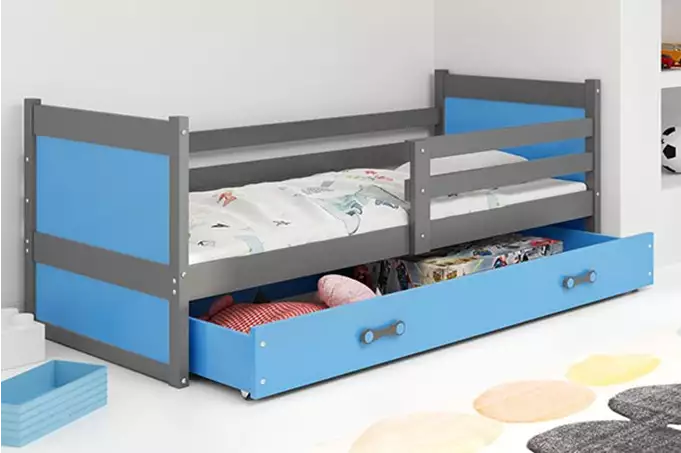 Dit jeugdbed is uitgerust met een innovatief klik-en-kliksysteem voor eenvoudige montage. Het unieke ontwerp met een radius R2 maakt het bed veilig voor jonge kinderen. De lade is praktisch voor het opbergen van speelgoed of kleding, en beschikt over robuuste wielen voor een soepele werking.