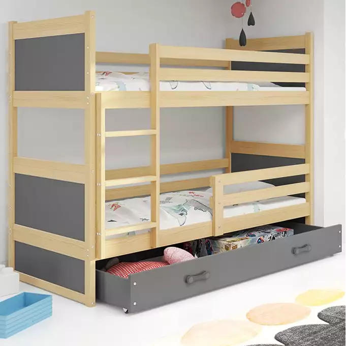 Het bed is voorzien van een unieke lattenbodem met birch spring latten, wat zorgt voor een goede ventilatie van de matras en extra comfort. Het click-clack systeem maakt de montage eenvoudig en snel, zodat je binnen enkele minuten een volledig functioneel bed kunt hebben. De lade onder het bed, gemaakt van spaanplaat, biedt extra bergruimte voor speelgoed of beddengoed, wat een praktische oplossing is voor kleine ruimtes.