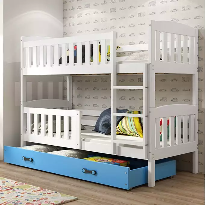 Perfect voor kinderkamers, de BMS KUBUŚ neemt niet veel ruimte in beslag en biedt toch voldoende slaap ruimte voor twee kinderen. De lade onder het bed is ideaal voor het opbergen van speelgoed, beddengoed of andere spullen, waardoor de kamer overzichtelijk en georganiseerd blijft.