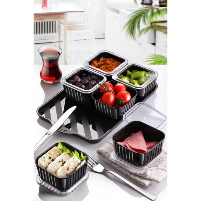 De ontbijtset bestaat uit een dienblad met afmetingen van 39 x 19 x 1,5 cm en zes kommen van 9,5 x 9,5 x 6 cm. De set is vervaardigd uit hoogwaardig acryl, dat niet alleen duurzaam is, maar ook een moderne uitstraling heeft. De kleur is elegant zwart, wat een verfijnde touch toevoegt aan je ontbijttafel.