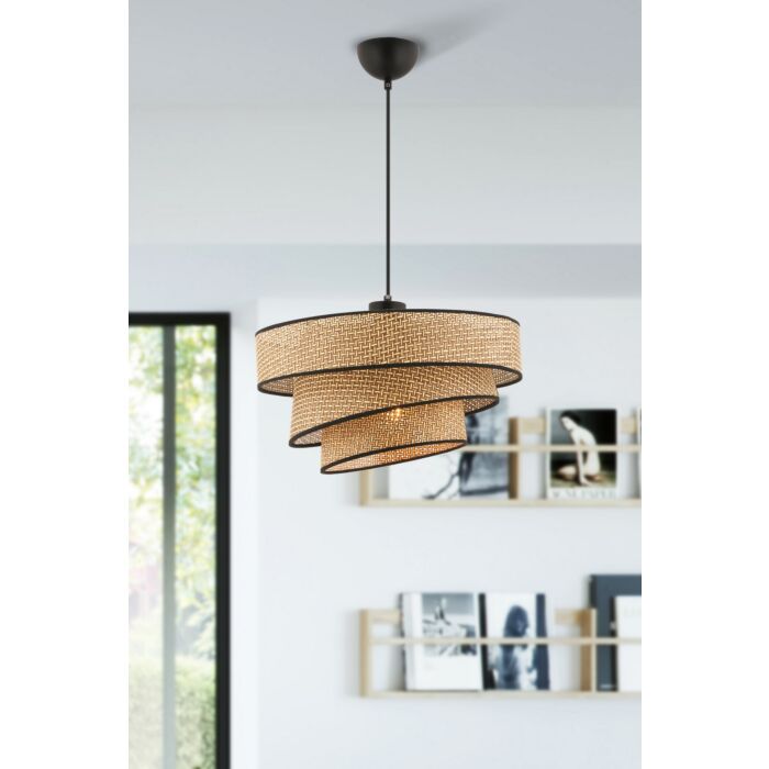 De kroonluchter heeft een afmeting van 40 x 40 x 72 cm en is vervaardigd uit hoogwaardige materialen: een metalen behuizing met een katoenen kap. De oude beige en moderne zwarte kleuren bieden een stijlvol contrast dat perfect aansluit bij diverse interieurstijlen.