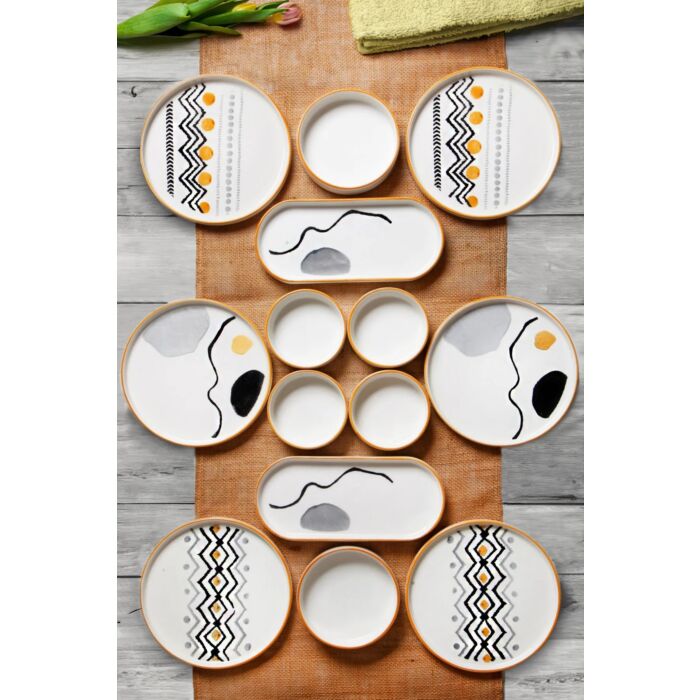 Deze ontbijset is vervaardigd uit 100% keramiek, dat niet alleen stijlvol is, maar ook stevig en duurzaam. De borden hebben een diameter van 19 cm, de schalen meten 25 x 11 x 3,5 cm, en de kommen hebben een afmeting van 10,5 x 10,5 x 3,5 cm. Elk stuk biedt een uitstekende functionaliteit en een verfijnd ontwerp om uw ontbijttafel op te fleuren.