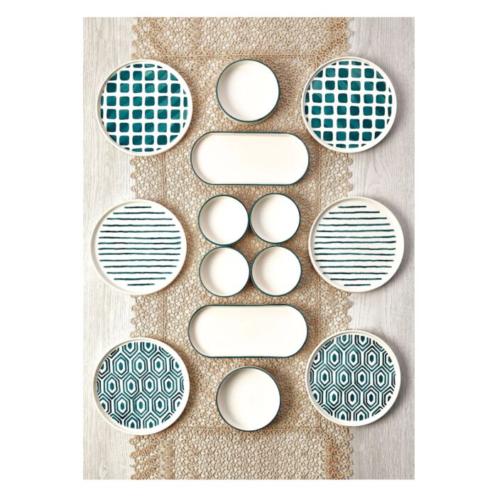 De set bestaat uit diverse onderdelen zoals borden met een diameter van 19 cm in totaal 6 stuks, twee schotels met afmetingen van 25 x 11 x 3,5 cm, en zes kommen van 10,5 x 10,5 x 3,5 cm met een inhoud van 150 ml. Gemaakt van 100% keramiek, biedt de set een hoogwaardige uitstraling en is ontworpen om lang mee te gaan.