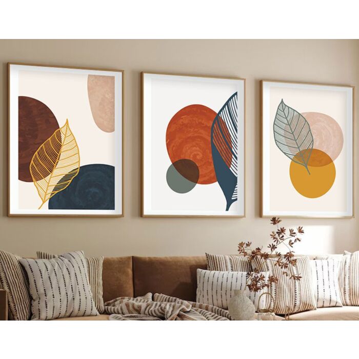 De set van drie schilderijen is vervaardigd uit 100% MDF met een dikte van 3 mm, wat zorgt voor een duurzame en kwaliteitsvolle uitstraling. Elk schilderij heeft een massief houten frame met een dikte van 2,5 cm, wat een extra dimensie toevoegt aan de presentatie.