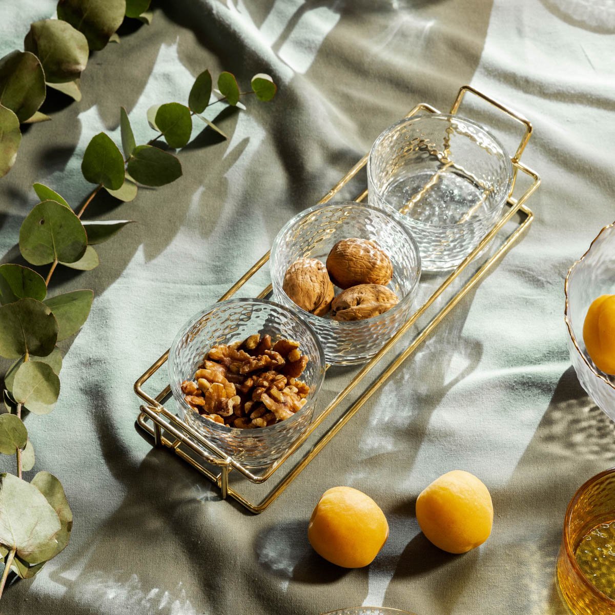 De SERENE set is een uitstekende keuze voor iedereen die houdt van een mooie manier om snacks op tafel te serveren. De set bestaat uit 3 borden en een metalen standaard met handvatten voor het handig dragen van de gehele set. De borden zijn gemaakt van transparant, geslepen glas, dat perfect samenkomt met de gouden kleur van de standaard. Het geheel vormt een uiterst harmonieuze compositie, vol elegantie en stijlvolle minimalisme.