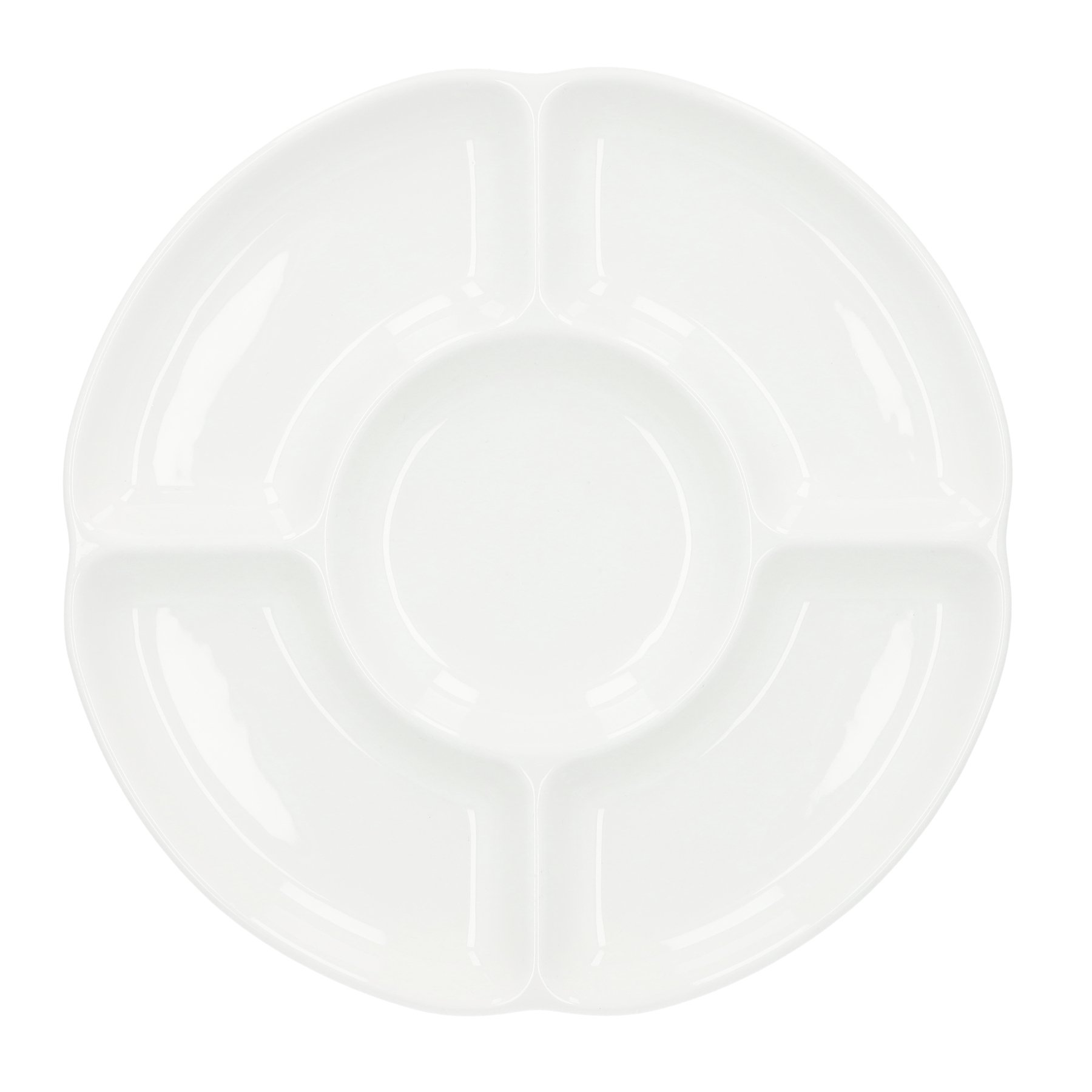 De FABIO platter heeft een diameter van 30 cm en is rond van vorm. Dit porseleinen stuk is niet alleen esthetisch mooi, maar ook functioneel, omdat het bestaat uit vijf secties die het mogelijk maken om kleine hoeveelheden van vijf verschillende delicatessen te serveren. Het gebruik van hoogwaardig wit porselein zorgt ervoor dat de platter een tijdloze uitstraling heeft die bij vrijwel elke tafelsetting past.