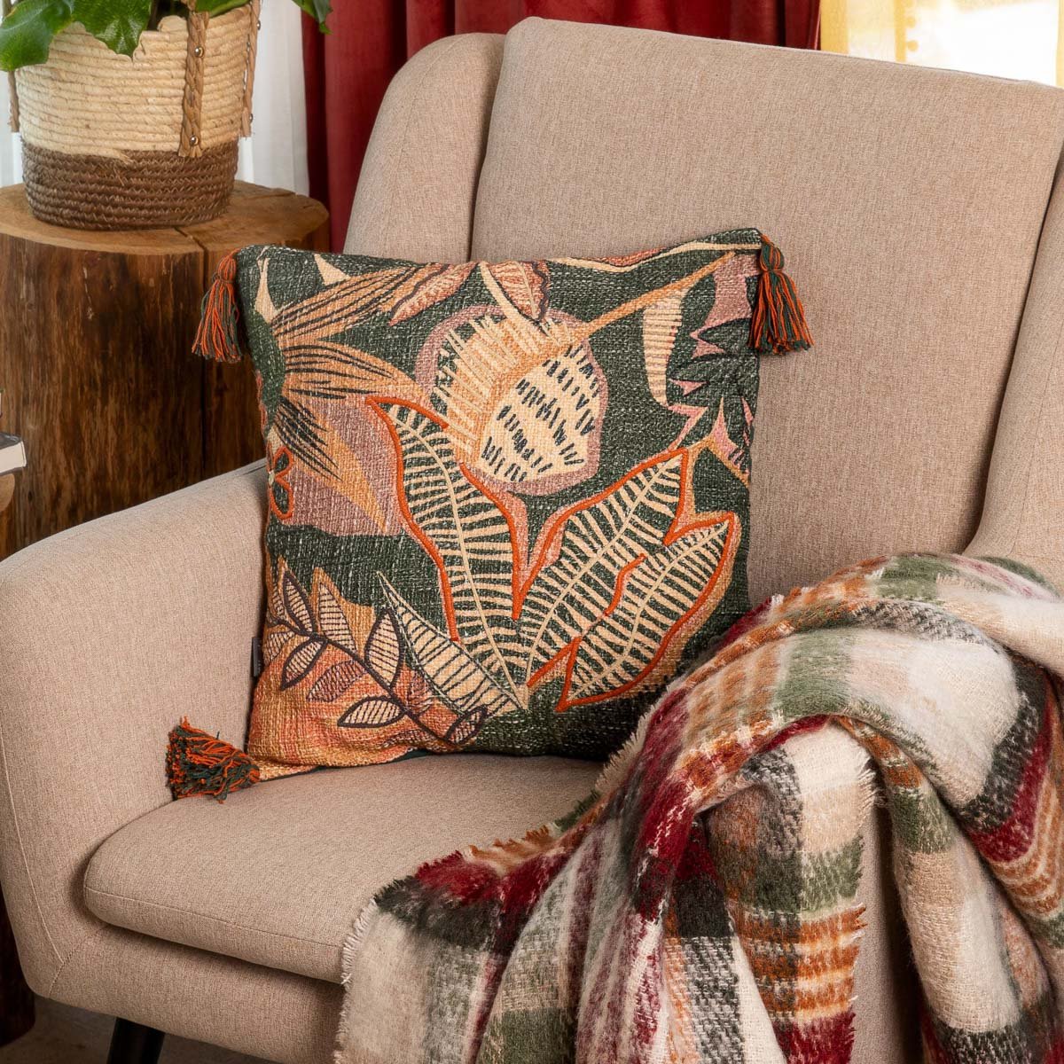 De HOMLA NAILA decoratieve kussensloop verrast met zijn prachtige ontwerp, zorgvuldige afwerking en hoge kwaliteit van de gebruikte materialen. De groene achtergrond is versierd met een bladerenpatroon, verrijkt met geborduurde details. De gebruikte kleuren maken de kussensloop tot een perfecte aanvulling op een herfstinterieur. De dikke franjes in de hoeken van de kussensloop bieden extra decoratie.