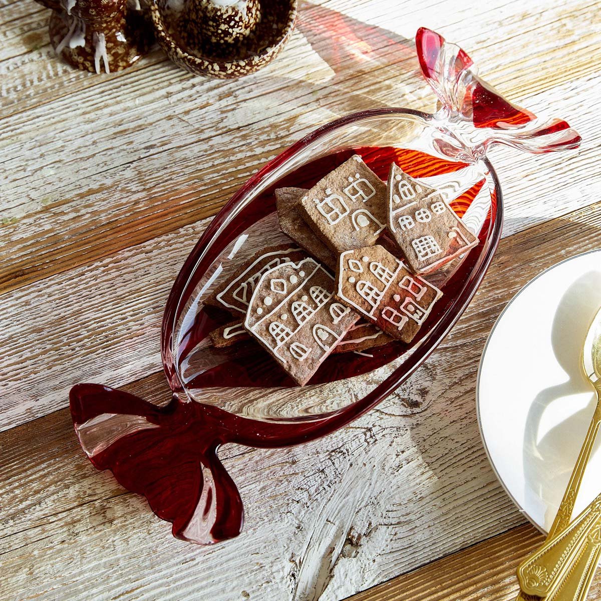 Serve festive treats in the most beautiful setting met de HOMLA CAREMELO glazen plaat. De plaat trekt de aandacht met zijn charmante snoepvorm in rood-transparante kleuren. De originele vorm en de kerstkleurcombinatie maken de plaat niet alleen een nuttig gerecht, maar ook een prachtige decoratie voor de kersttafel.