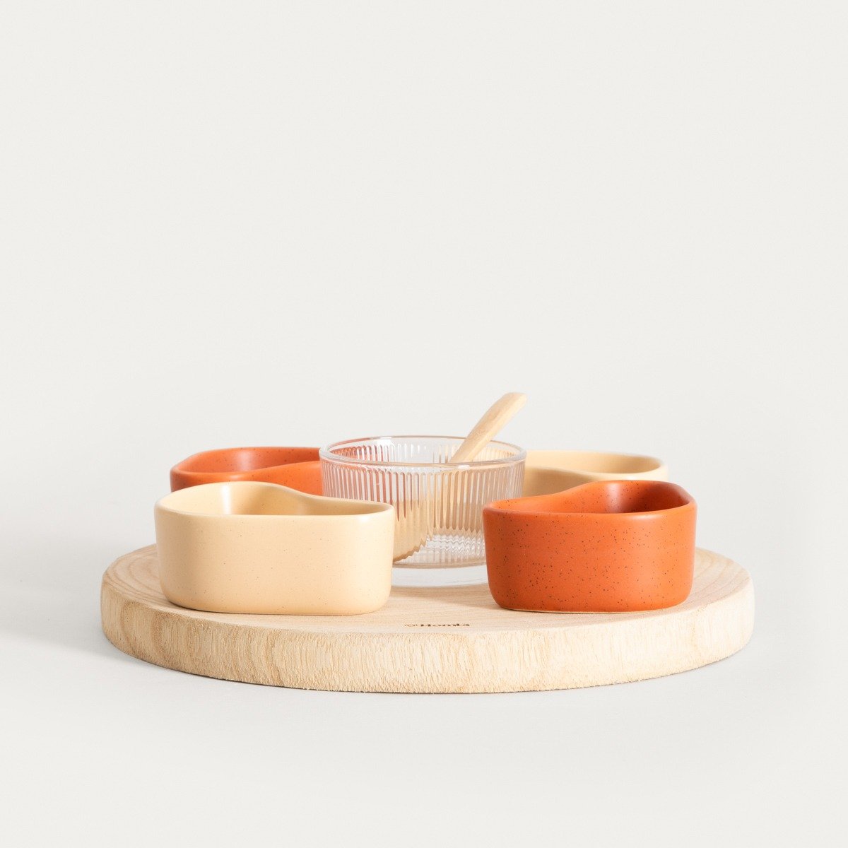 Op zoek naar een opvallende manier om snacks te serveren? De GRENADA set is een stijlvolle en praktische oplossing die charme toevoegt aan elke thuismaaltijd. De keramische kommen in warme, aardetinten passen perfect bij de glazen kom en houten lepel. Het geheel wordt elegant gepresenteerd op een ronde basis, wat zorgt voor een samenhangende en esthetisch verantwoorde set.