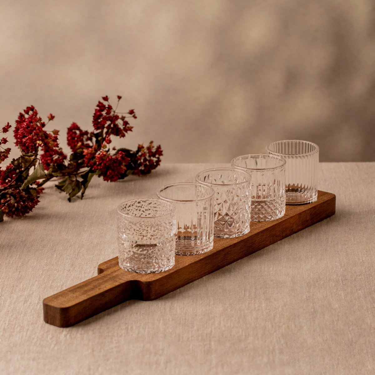 Op zoek naar een manier om drankjes uniek te serveren? De AMUZO-set nodigt uit om speciale momenten te vieren in een elegante omgeving. Elke glazen bevat een uniek ontwerp en de set wordt aangevuld met een houten dienblad met een handige handgreep.