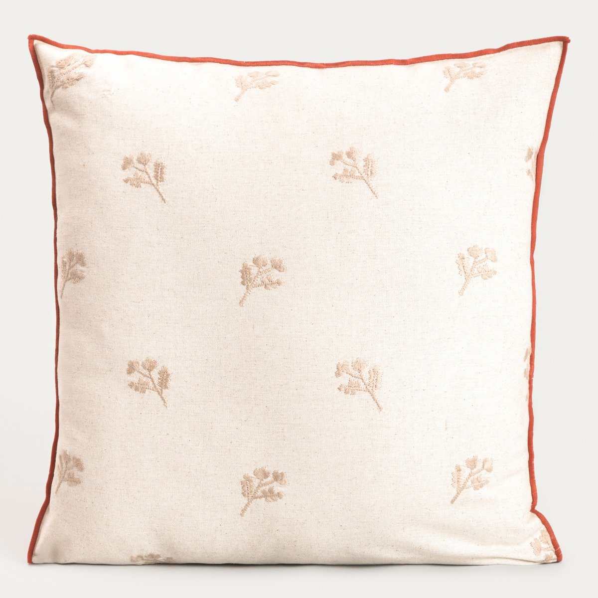 De FROID kussensloop is een elegant accessoire dat een vleugje natuurlijke charme aan uw interieur zal toevoegen. De subtiele bloemenborduursels en contrasterende piping geven het een uniek karakter, waardoor het perfect is voor boho-, Scandinavische of landelijke omgevingen.