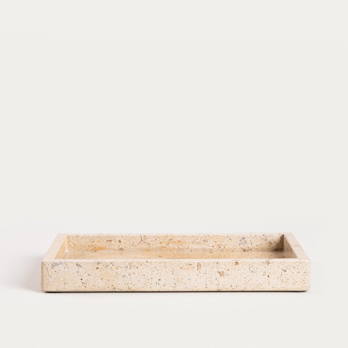De MARMURI tray heeft een rechte, elegante vorm in een neutrale beige kleur, wat hem perfect maakt voor gebruik in verschillende interieurstijlen. Het minimalistische ontwerp maakt het een veelzijdig decoratief object.