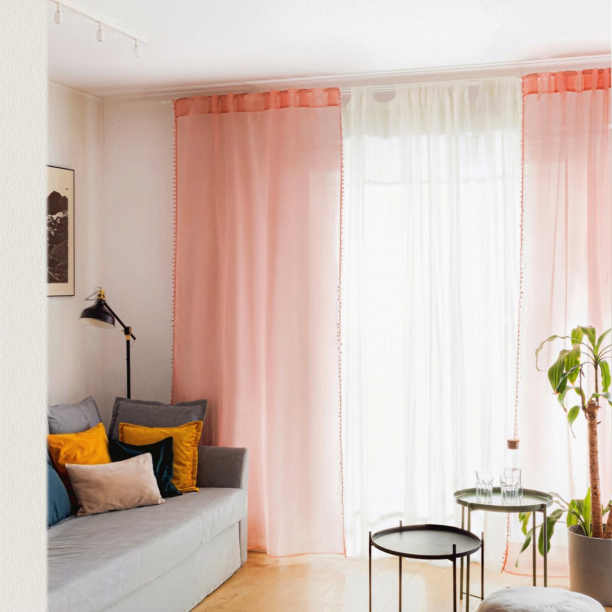 De luchtige HOMLA ADI gordijn voegt subtiliteit en charme toe aan uw interieur. Het geheel is uitgevoerd in een lichte roze kleur, en de zijkanten zijn versierd met kleine pompons. Wanneer het in het raam wordt gehangen, verspreidt het perfect het zonlicht terwijl het privacy biedt en een aangename sfeer in de kamer behoudt.