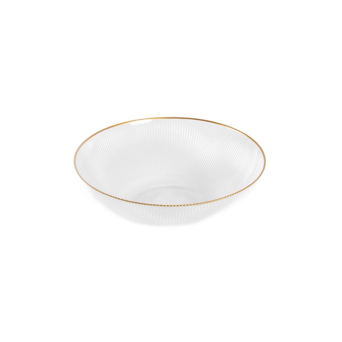 Verhoog de elegantie van je tafel met de grote LYNN bowl. Dit stijlvolle stuk heeft een subtiel ribbelontwerp en een gouden rand die elk gerecht een unieke uitstraling geeft. De transparante oppervlakte draagt bij aan de lichtheid, en de grote maat maakt deze kom ideaal voor het serveren van salades, fruit of snacks bij grotere bijeenkomsten.