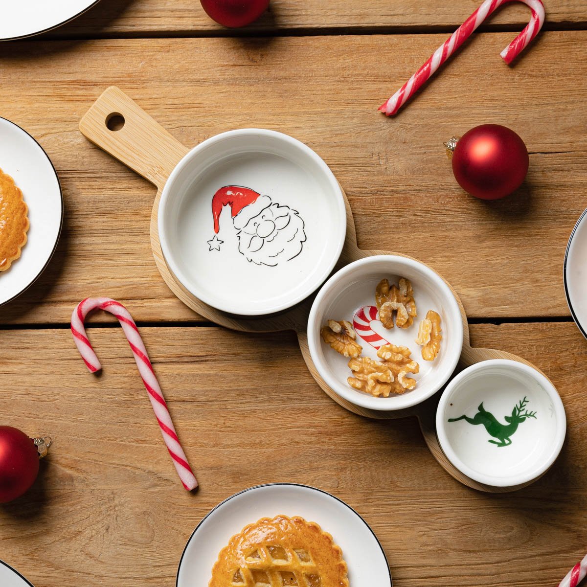 De HOMLA TROEL serveerplank biedt een stijlvolle en praktische oplossing voor het presenteren van sauzen, dips en snacks op tafel. Met drie verschillende kommen die zorgen voor een aantrekkelijke opstelling, is deze set perfect voor feestelijke gelegenheden.