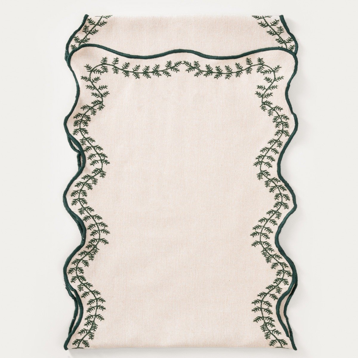 De MARVIL runner is een uniek accessoire dat elegance en feestelijke charme aan uw tafel toevoegt. De lichtgekleurde stof is versierd met subtiele groene borduursels en afgewerkt met een decoratieve piping in dezelfde tint. Dankzij de zorgvuldige details en harmonieuze kleurcombinatie brengt de tafelrunner een warme, feestelijke sfeer in uw interieur.