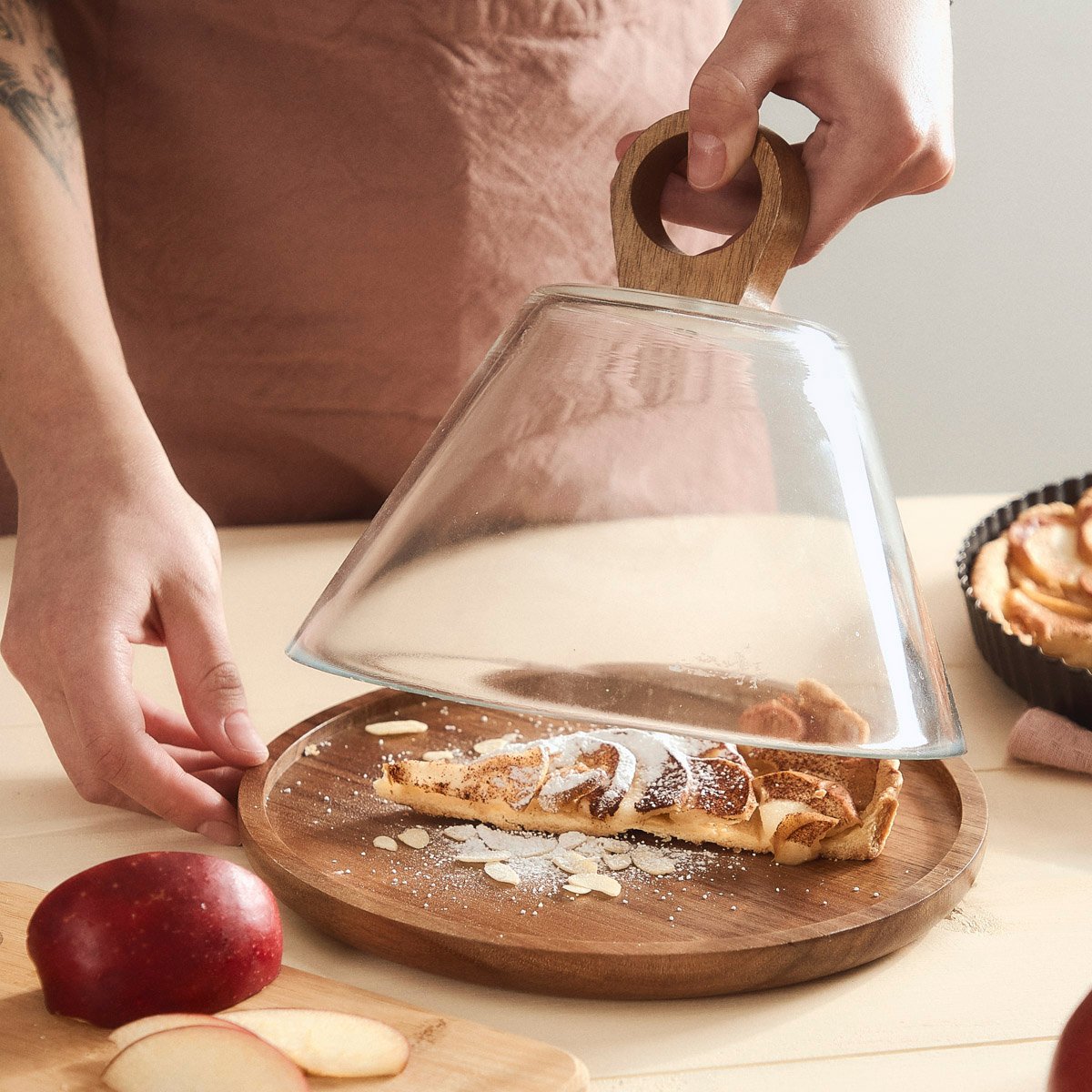 De platter en de handgreep van de schuilkap zijn gemaakt van hout, terwijl de schuilkap zelf van glas is gemaakt. De schaal moet met de hand gewassen worden.