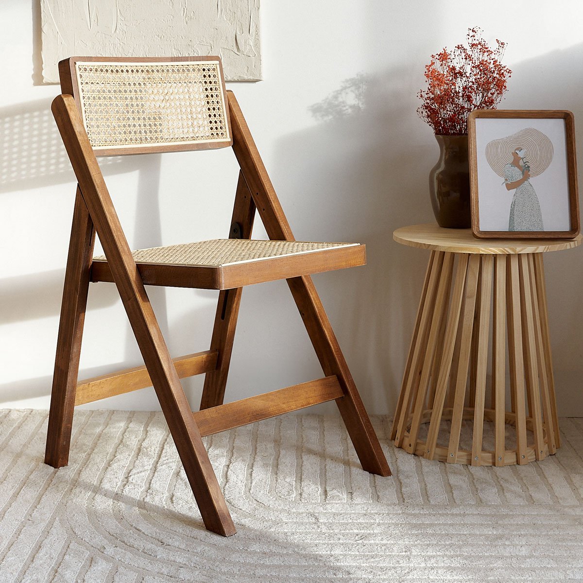 Het frame van de stoel is gemaakt van hout, terwijl de zitting en rugleuning van natuurlijk riet zijn. De gebruikte materialen zijn duurzaam en eenvoudig schoon te houden. De stoel vouwt gemakkelijk op, waardoor je het comfortabel kunt dragen en opbergen wanneer het niet in gebruik is.