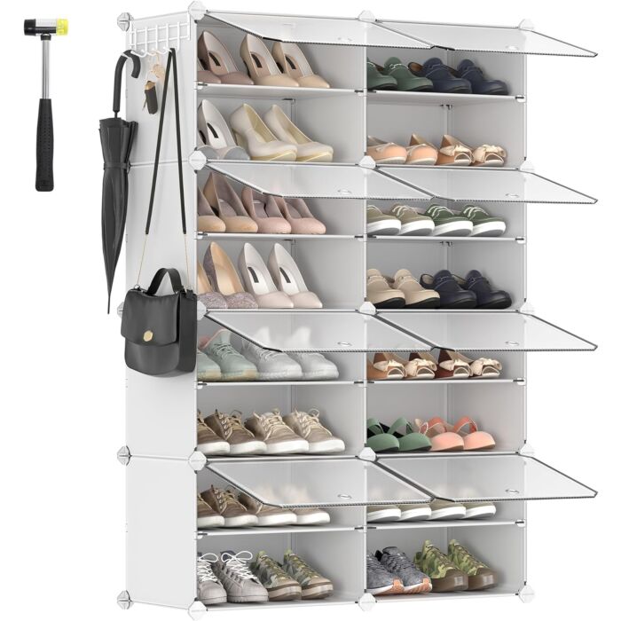 Dit schoenenrek heeft een afmeting van 12,6 inch diep, 48,8 inch breed en 37 inch hoog (32 x 124 x 94 cm). Het is vervaardigd uit hoogwaardige materialen, zoals ABS kunststof voor de connectoren, PP kunststof voor de panelen en een stevige stalen frame dat zorgt voor stabiliteit en duurzaamheid.