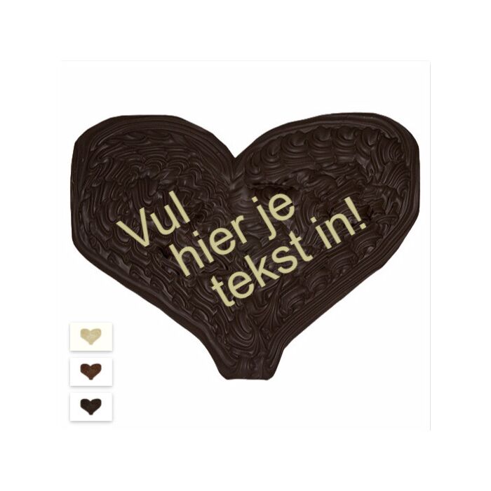 Ken jij iemand die geslaagd is voor zijn diploma? Of wil je je geliefde verrassen? Maak je eigen persoonlijke chocoladehart. Al onze heerlijke chocoladeharten zijn te voorzien van een tekst in chocolade. Bij een wit hart spuiten we de tekst in pure chocolade; bij een melk- of puur chocoladehart spuiten we de tekst in witte chocolade. Je kunt naast dit overzicht je chocoladehart volledig samenstellen: 1. Selecteer welke smaak je wilt (wit, melk of puur). 2. Typ de gewenste tekst. De ruimte is beperkt tot circa 10–15 tekens. 3. Tevreden? Geef het aantal op en klik op ‘Toevoegen aan winkelwagen’. 4. Wil je meer harten bestellen? Klik op ‘Verder winkelen’ en begin opnieuw bij stap 1. Afmetingen: 220 x 175 x 6 mm Gewicht: ca. 350 gram Prijs: € 11,95 per stuk
